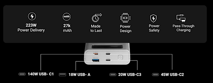 Versatile Charging: 223W total output with 3 USB-C ports, a USB-A port, and 15W Qi2 wireless charging—all in one lightweight device.